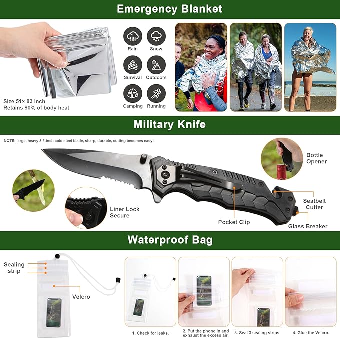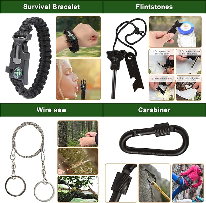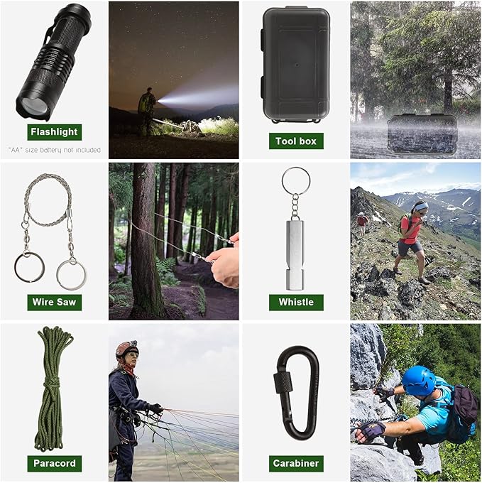 - Essential SOS Survival Tools: The upgraded survival kit contains everything you need in case of emergency, such as earthquakes, hurricanes, tornadoes, floods, fires and other natural disasters, or wilderness adventures. It is perfectly suited for people who like hiking, hunting, mountain biking, wilderness survival, etc.