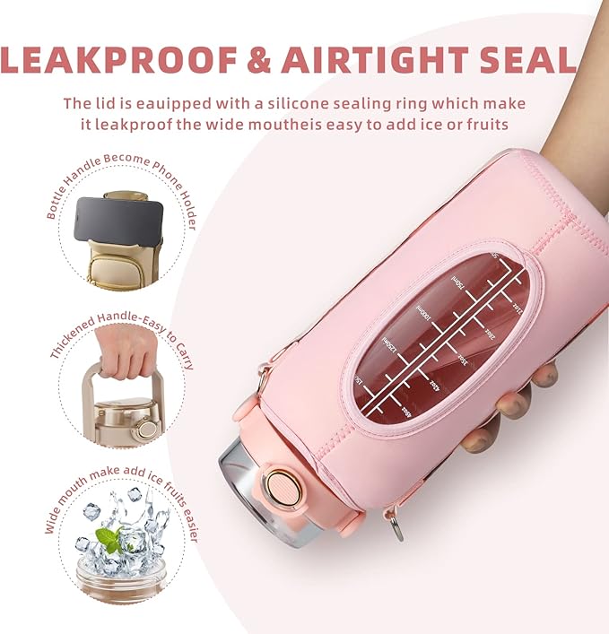 - Glass Water Bottle With Sleeve and Strap: This glass water bottle with straw is designed with high quality 5mm Neoprene sleeve to protect water bottle from slight bumps and absorb sweat to avoid dripping on table or seat. It’s an all-in-one water tracker bottle, water bottle sleeve with 2 pockets to storage phone, card,airpods, key and motivational water bottle with comfortable padded shoulder strap & wrist strap for hands free carrying. You can adjust the strap ensure a snug fit