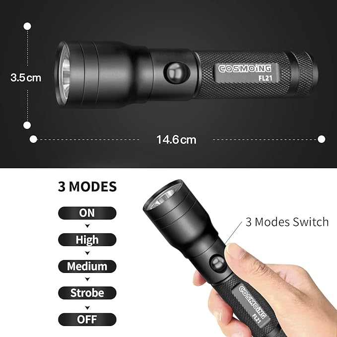 - 【ULTRA BRIGHT & DURABILITY】When you hold the COSMOING LED Flashlight, It will easily brighten an entire room or focus in one object up to 800+ feet away! 20 times brighter than normal-purpose flashlight. Conveniently max powered 4 hours with high capacity rechargeable battery。