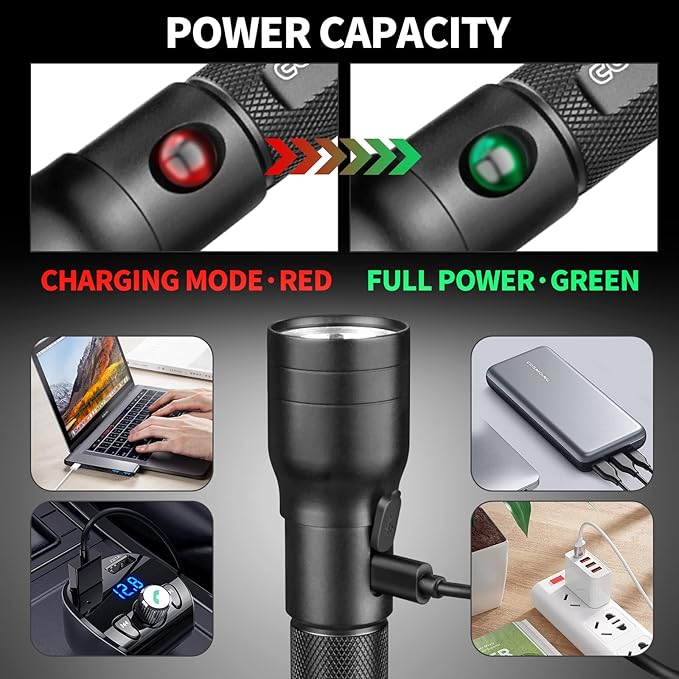 - 【TYPE-C RECHARGEABLE】Recharge the handheld flashlight through any USB port, such as computer, powerbank or in the car. Use rechargeable battery save lots of battery cost and environmental friendly.