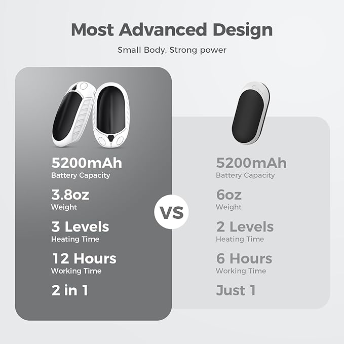 - Long-lasting Heating Than Ever - This electric hand warmer adopt a new heating scheme and battery, minimal weight and maximum lasting Heating, provide up to 12 hours of heat.