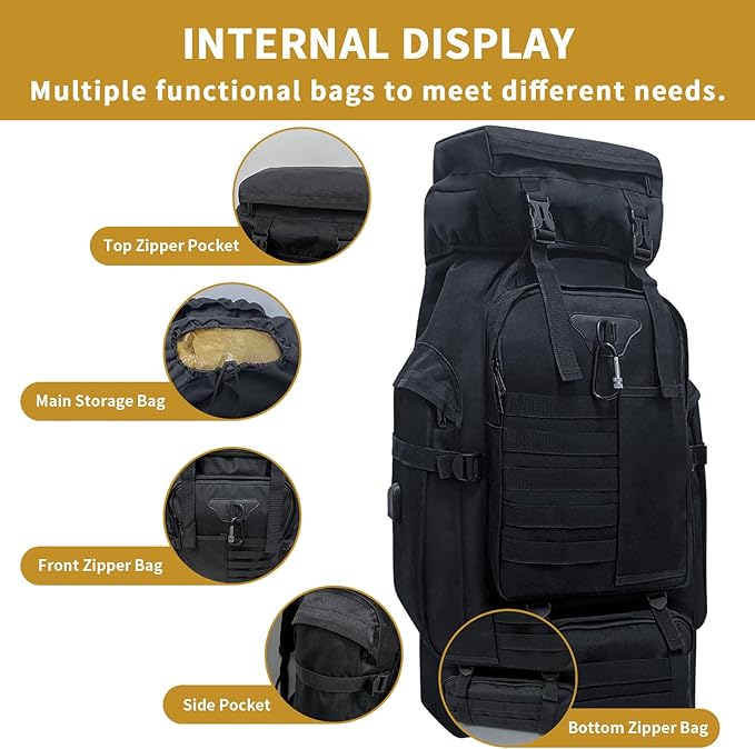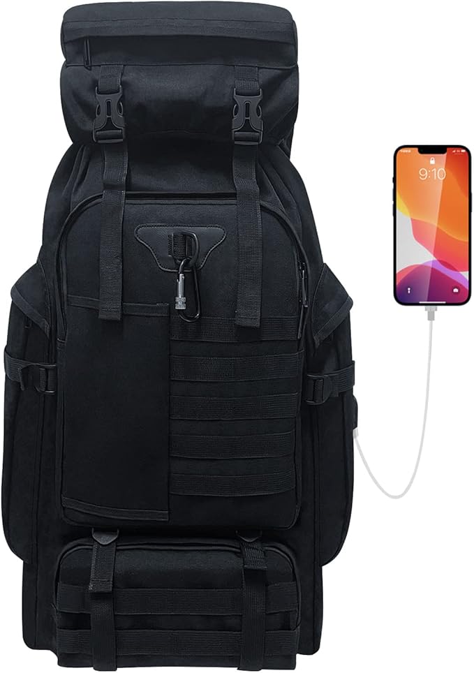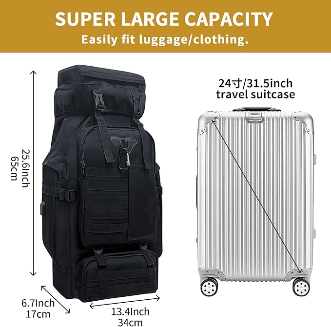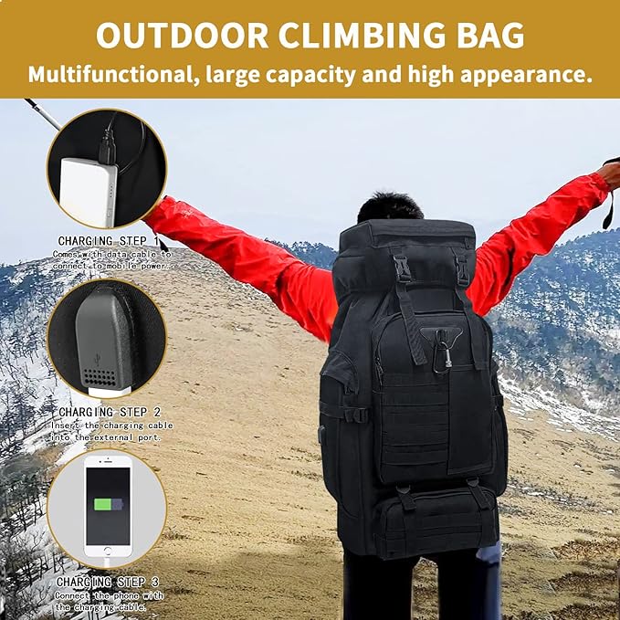 80L Camping Hiking Backpack, Large Military Tactical Backpack, Waterproof Travel Daypack With Carabiner Outdoor Molle Rucksack for Men Women (Black)