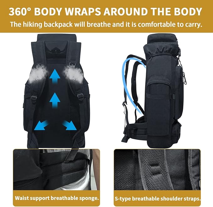 - 80L HIKING BACKPACK: The 80L large capacity camping backpack, enough room for 3 or 4 days trips. Main storage bag with elastic drawstrings that can expand the pack, it's roomy enough for you to put in sleeping bag, mat, hammock or shoes and other equipment & accessories, 2 front zippered pockets and two side pockets for separate and orderly storage.