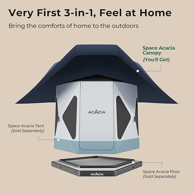- 3-IN-1 NEW CAMPING SYSTEM: The Space Acacia consists of a spacious, modern glamping tent, the first-of-its-kind proprietary air floor and the innovative, temperature-adjusting canopy. All 3 thoughtfully designed components work in harmony to enable you to live an indoor lifestyle, outdoors.