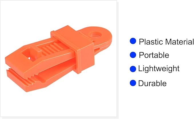 - DURABLE DESIGN: 1. The tarp clip is made of durable plastic material, which is lightweight, portable, wear-resistant and reusable. 2. The slide-lock design makes it easy and quick to tighten or loosen the tent clips. 3. Toothed clips can hold the tarp firmly and prevent it from falling off.