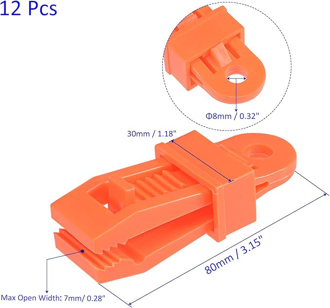 - PACKAGE INCLUDE: 12 Pack of Orange Tarp Clips, which overall size is 80mm x 30mm x 25mm / 3.15 x 1.18 x 0.98 inch (L*W*H), hole dia is 8mm / 0.32 inch, max open width is 7mm / 0.28 inch.