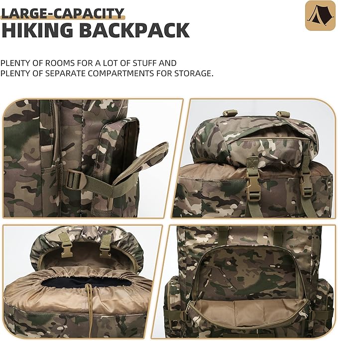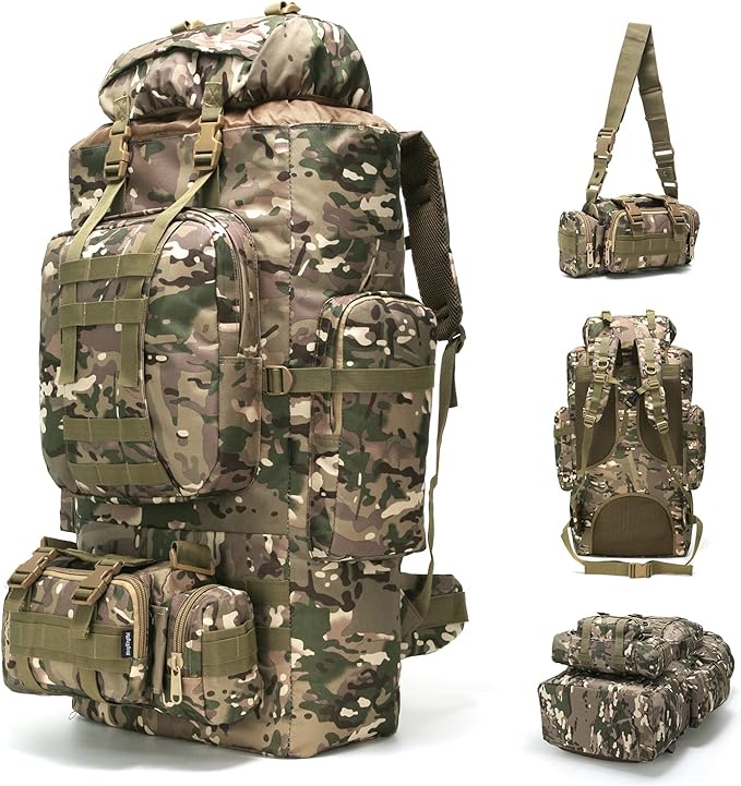 - Separate Belt Bag : 100l molle pack has an independent belt bag that can be used as a shoulder bag or messenger bag.It is very convenient to carry, you can store some things you need at any time,like water,flashlight ,Cell phone,Headphones,sunglasses,etc.