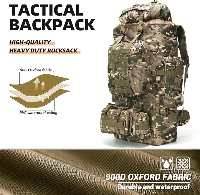 - Military Backpack High Material : The camping military rucksack is made of 900D Oxford cloth fabric and waterproof material,wear resistant,tear resistant,anti-Scratch.This military tactical backpack bags with strong hanging system to carry more items.