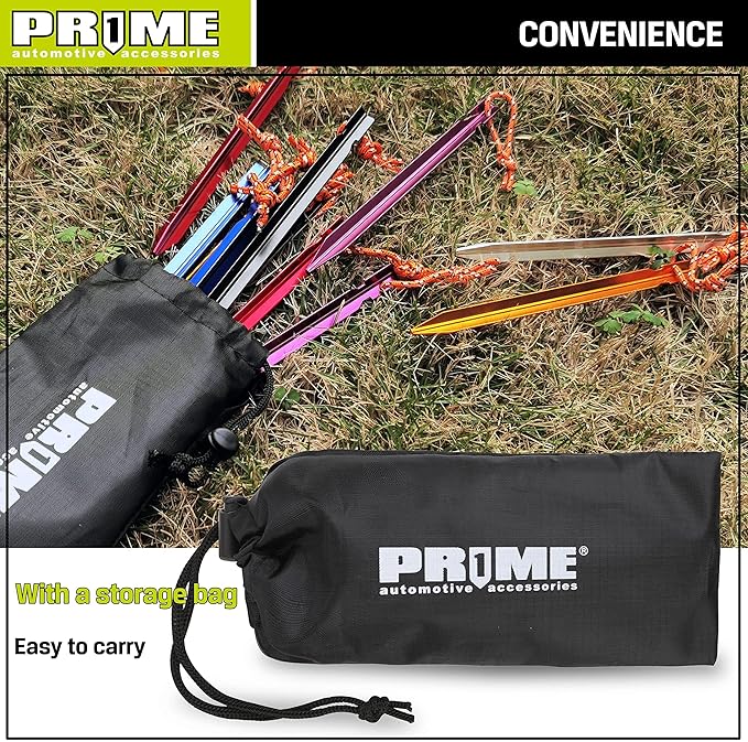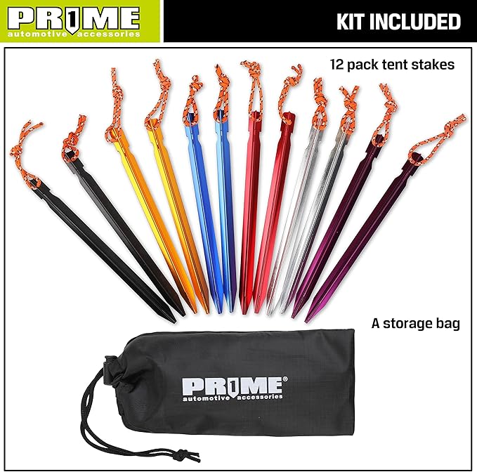PR1ME Aluminum Tent Stakes, 12 Pack Lightweight Stakes Pegs Heavy Duty Camping Spikes, Ultralight Tent Nail with Reflective Rope, Carry Bag, Tent Accessories for Camping Rain Tarps Hiking Backpacking