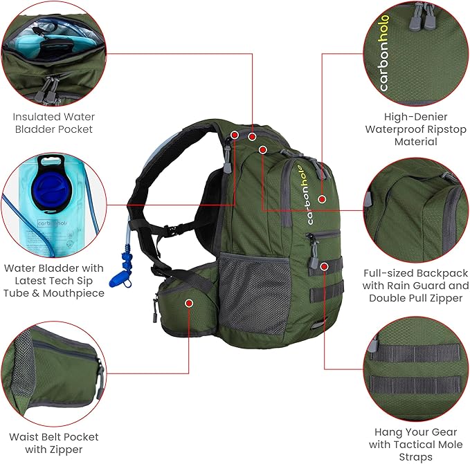 - Insulated Hydration Pocket With Water Bladder: The carbonHolo ULTRA Hydration Backpack includes a 2-liter water bladder with cold shield liner insulation. The insulated pocket maintains water temperature, keeping it cold for up to 5 hours.