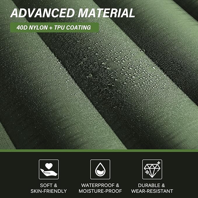 - Camping Grade Material: This sleeping mat is made of 40D nylon coated with TPU coating, providing extreme pressure-bearing. The edge of the camping mat is heat-sealed, so you don't have to worry about air leaks or tears, even under harsh conditions