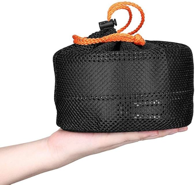 - 【Lightweight, portable and durable】The handle of this backpacking cooking set is foldable, can effectively save you space and all accessories fit into the pot and come with a lid to ensure they don't get lost. The mesh bag has a shrink cord for easy hanging on the backpack.