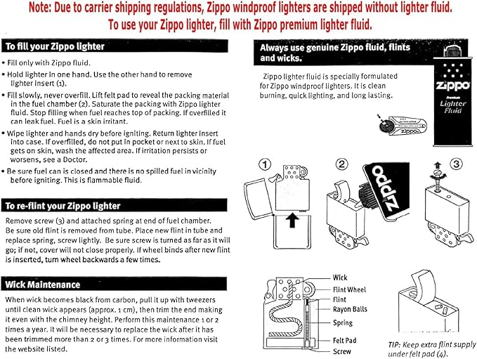 - Due to carrier shipping regulations, Zippo windproof lighters are shipped without lighter fluid. To use your Zippo lighter, fill with Zippo lighter fluid (sold separately).