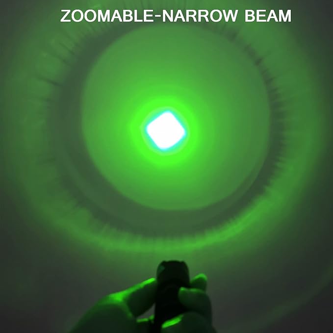 - ADJUSTABLE FOCUS: This green hunting flashlight has adjustable focus with zoom function that is for long range illumination and wide range illumination.
