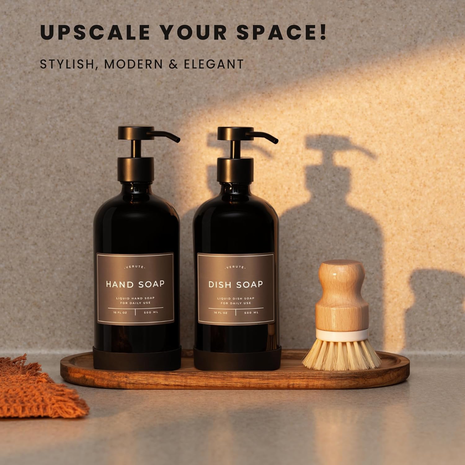 16oz Glass Soap Dispenser with Stainless Steel Pump, 21 Waterproof Labels, Non-Slip Protective Silicone Pad, Set of 2 for Bathroom & Kitchen (Gloss Black Bottle/Black Pump)