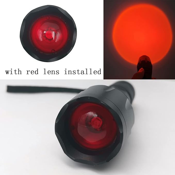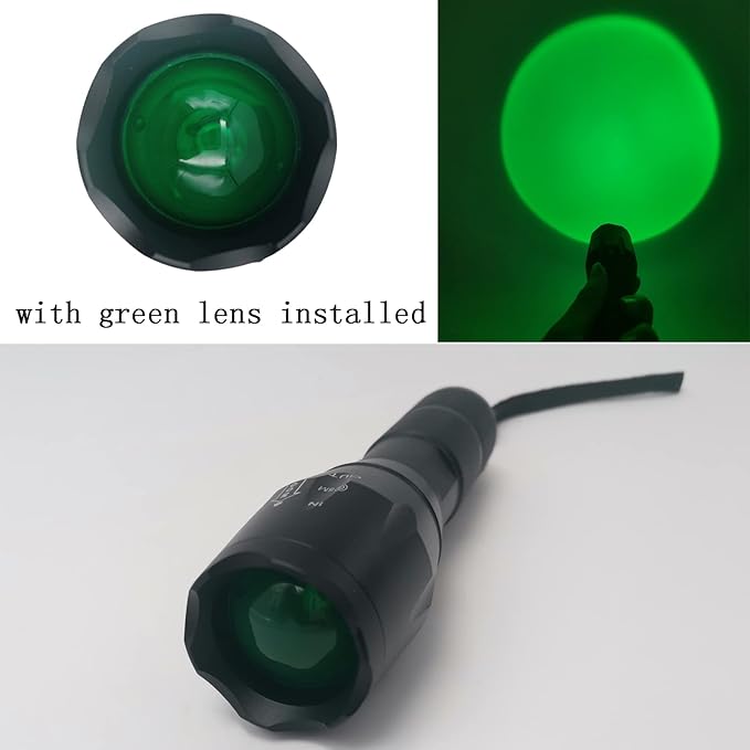 - 3 COLOR LIGHT: It’s a single mode led flashlight with clear glass lens equipped, one red glass lens and one green glass lens, the original light of this flashlight is white light, which can emit red light or green light with red lens or green lens installed on. Installation is easy that just unscrew the lens on flashlight and screw the new lens on.