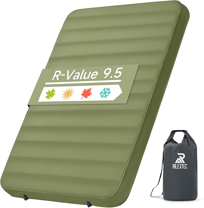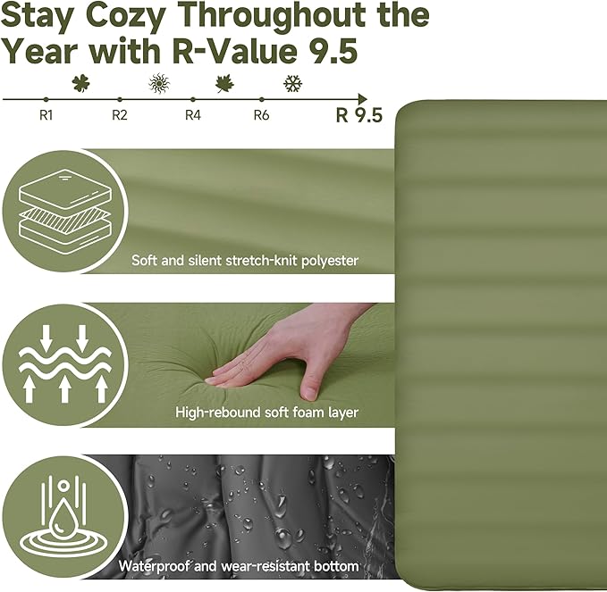 - 【Suitable for All Season】With an R-Value of 9.5, our foam camping mattress provides excellent insulation for both winter warmth and summer breathability. The foam filling ensures the comfort and insulation in various outdoor adventures. With the durable fabric composite TPU layer, our sleeping mattress is waterproof, suitable for all season, easy to clean!
