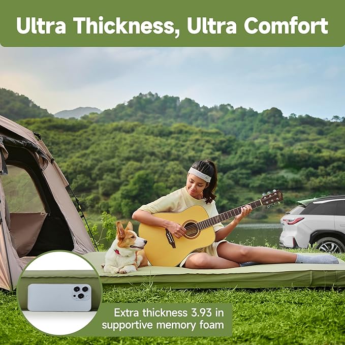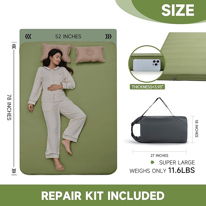 - 【4''Extra Thickness & Spacious for all sizes】The double camping mattress for 2 person is as thick as 4'' once fully inflated, provides good comfort and supporting up to 600 lbs. Our car air mattress with 78"x52" is wide enough for 2 person sleeping on it, also allow you to stretch yourself and let your body truly relax after an exhausting day!