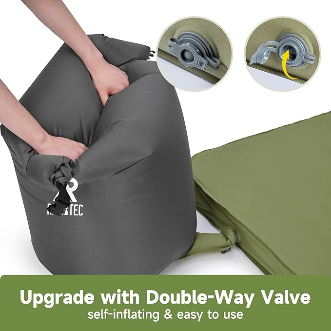 - 【Easy Inflation & Firmness Adjustment】With the Double Way Valve, this self inflating camping pad is super easy to inflate, just need to open the valve, and you’re good to go. However, it’s a little difficult to deflate and pack this camping mattress because it’s bulky and weight. To solve this problem, you can reverse the valve cover and install it to the valve, in case to self inflate when you squeeze the air out!