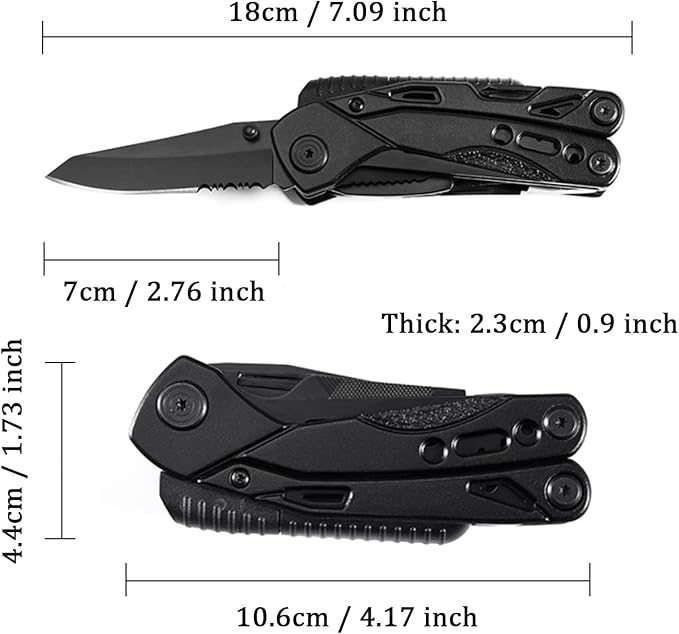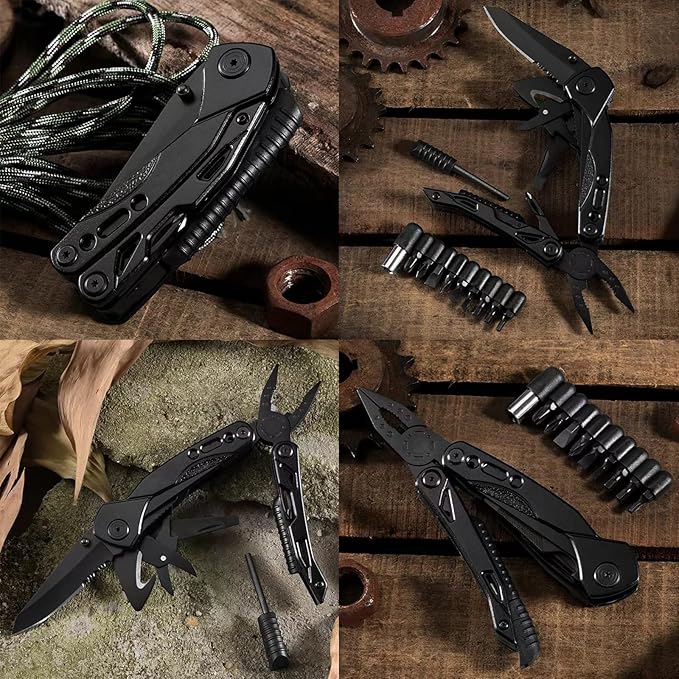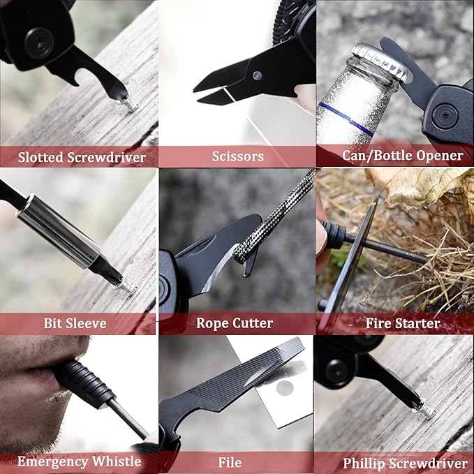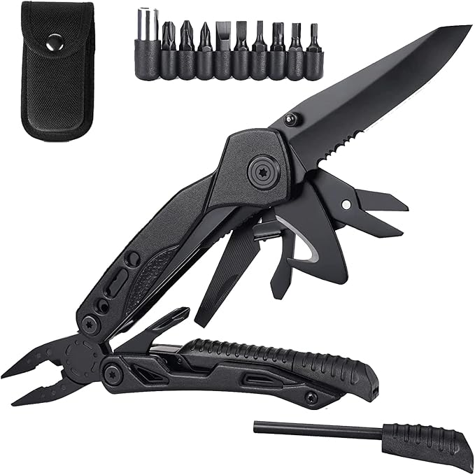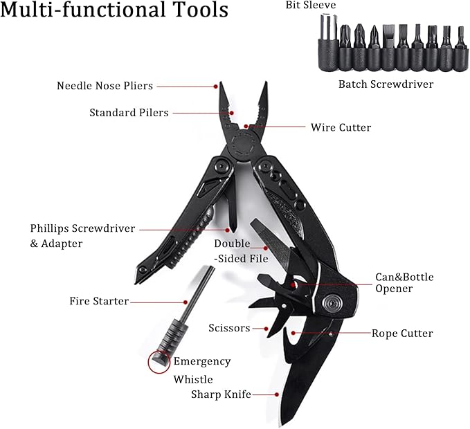 - A High Quality Multi-functional Tool: Our high quality multi tool includes Needle nose Pliers, Standard Pliers, Wire Cutters, Sharp Knife, Serrated Knife,Scissors,Fire starter,Emergency whistle,Can Opener, Bottle opener,Slotted Screwdriver (M)(L),Phillips Screwdriver,double-sided file,Rope Cutter,and a screwdriver with a 9-in-1 bit set. It also comes with a sturdy nylon bag, you can put it into pocket or hung on belt.