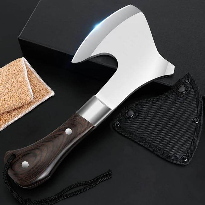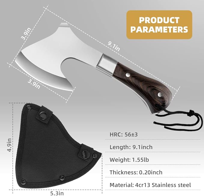 - 【Multipurpose Axe Knife】This axe knife would be a perfect choice to use it in the kitchen, camping, barbecue, hiking or hunting. The axe knife not only good at take meat off bone, but also deftly cut, slice, and dice with meat and vegetables. It will effectively chop off whatever you desire in your kitchen with its powerful blade with the minimum effort. It is suitable for professional chefs, amateurs and outdoor adventurer to use at home kitchen and in outdoor or for collection.