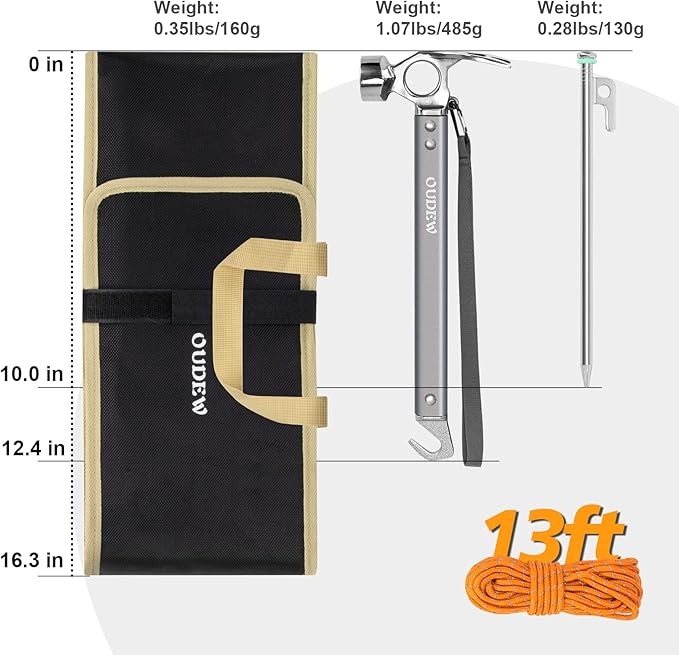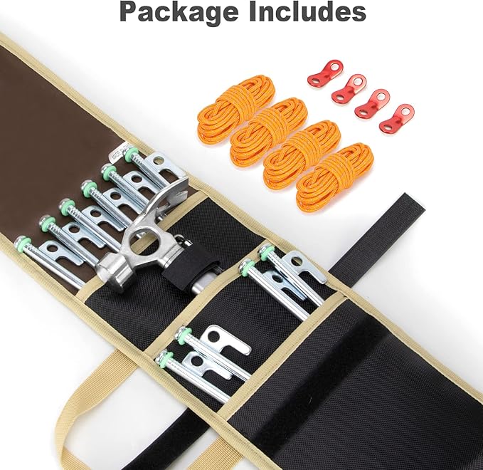 - CAMPING ACCESSORIES KIT INCLUDE: 1 camping hammer, 10 camping stakes, 4 reflective tent ropes with aluminum adjuster and 1 storage bag