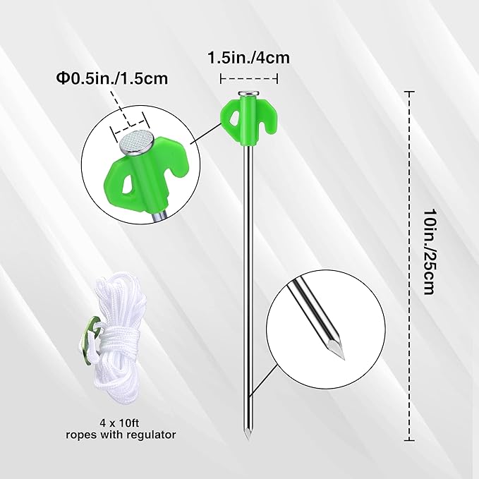 - Heavy Duty Camping Stakes:1/4” Thick Galvanized metal for corrosion resistance and longer use.