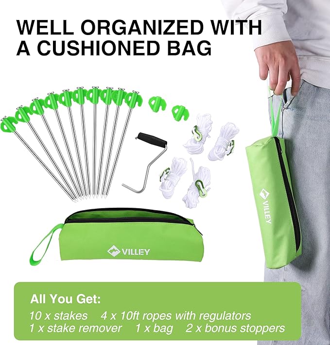 - What You Get: 10 Tent Stakes, 4 ropes, 2 bonus stoppers, 1 stake remover, 1 Storage Bag