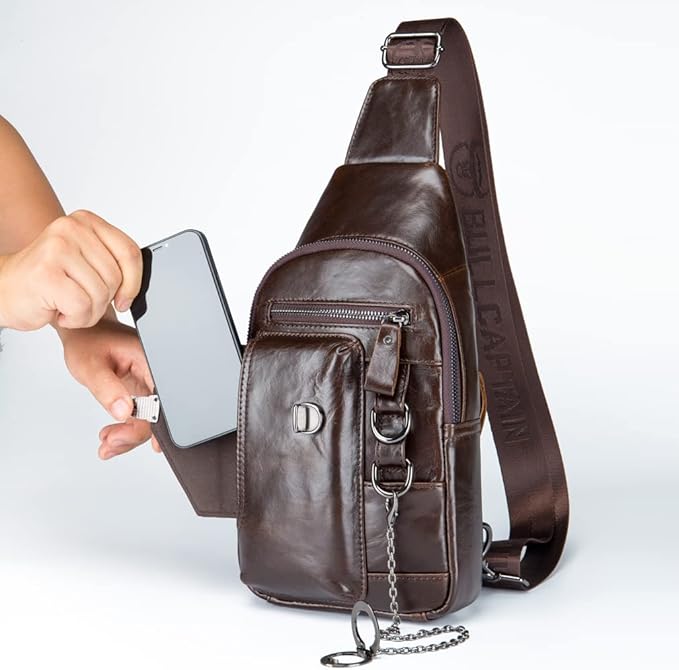 KPYWZER Vintage Genuine Leather Sling Bag Backpack for Men Crossbody with Cellphone Stand Chain Chest Shoulder Crossbody Daypack Coffee