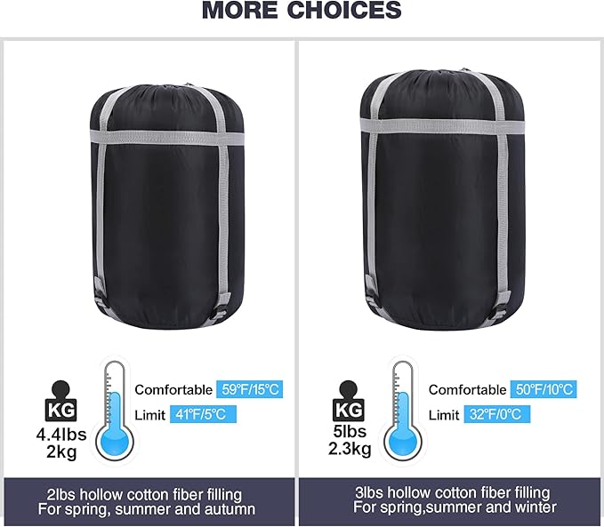 - TEMPERATURE RANGE: 3lbs filling sleeping bags is comfort in 41°F(0 degree cold weather) and fits temperature range 32-50 °F/0-10 °C. Females are recommended to choose the thicker sleeping bags.