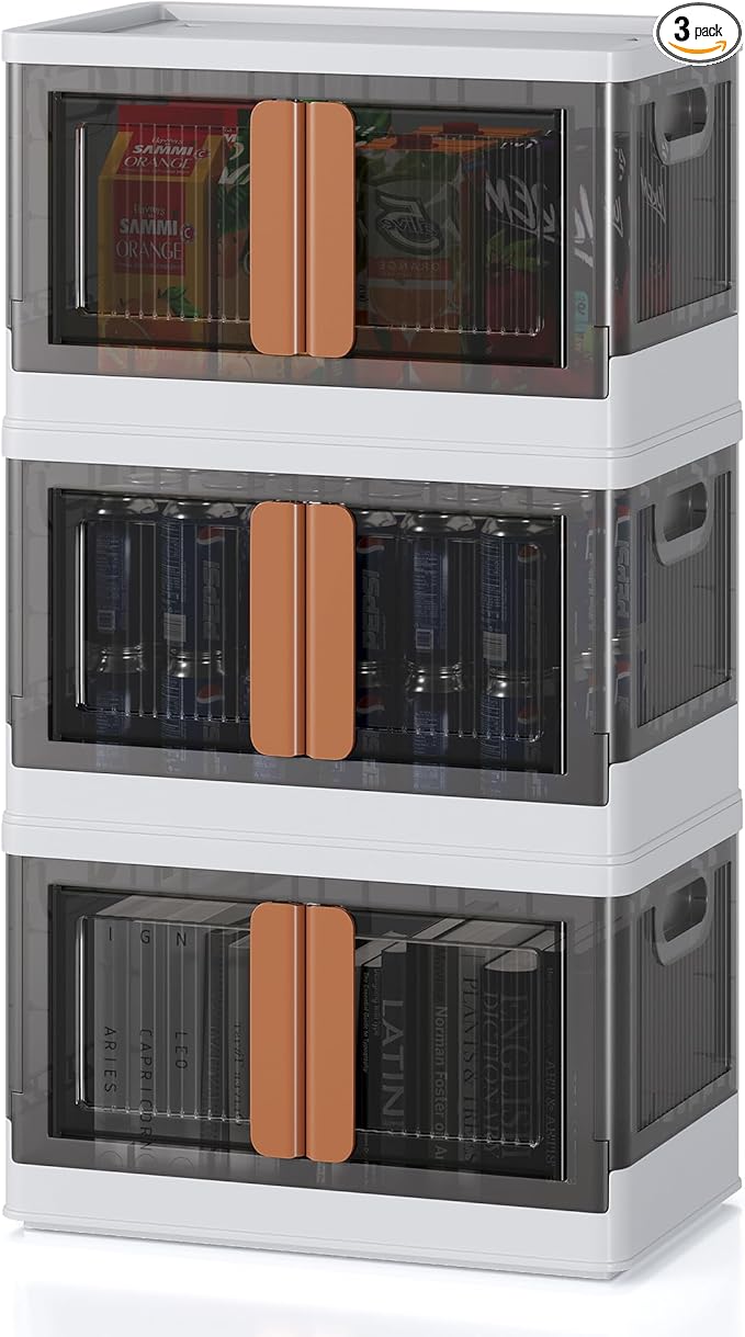 8.4Gal Collapsible Storage Bins with Lids & Wheels - 3 Pack Stackable with Doors, Heavy-Duty Plastic Containers for Home/Office, White