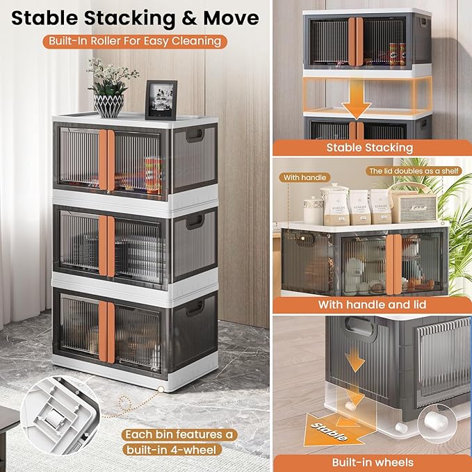 19Gal Collapsible Storage Bins with Lids & Wheels - 3 Pack Stackable with Doors, Heavy-Duty Plastic Containers for Home/Office, White