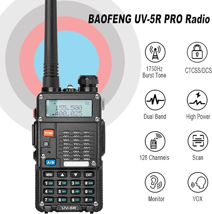 - Included Components : 2 × Baofeng UV-5R Pro radio, 2 × Rechargeable Li-ion Batteries, 1 × High Gain Antenna, 1 × Original Antenna, 2 × Earpiece, 2 × Handmic, 2 × Charger, 1 × Programming Cable, 2 × Wrist Strap, 2 × Belt Clip, 1 × User Manual 2 × Baofeng UV-5R Pro radio, 2 × Rechargeable Li-ion Batteries, 1 × High Gain Antenna, 1 × Original Antenna, 2 × Earpiece, 2 × Handmic, 2 × Charger, 1 × Programming Cable, 2 × Wrist Strap, 2 × Belt Clip, 1 × User Manual