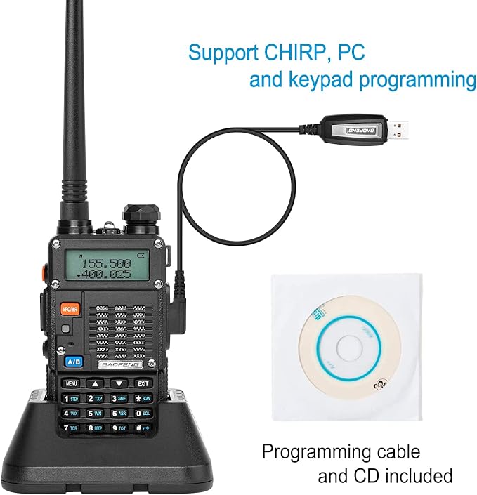 - Programmable radio: 128 channels, the BAOFENG radio kit includes a Baofeng programming cable and programming software, easy to program via PC and keypad, also support CHIRP quick programming