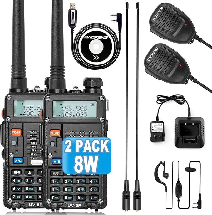 - Package Includes: 2 × 8W Baofeng UV-5R Pro radio, 2 × 1800mAH Rechargeable Li-ion Batteries, 1 × High Gain Antenna, 1 × Original Antenna, 2 × Earpiece, 2 × Handmic, 2 × Charger, 1 × Programming Cable, 2 × Wrist Strap, 2 × Belt Clip, 1 × User Manual