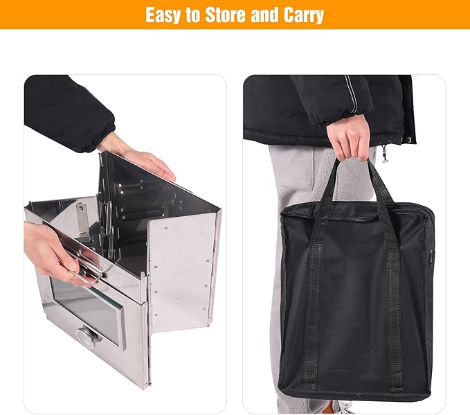 - Easy to Store and Carry: Our camping oven adopts a foldable design. Its foldable size is 11.8x11.8x3inches/30x30x7.5cm. In addition, we also provide a storage bag. You can put the oven into the storage bag, which is very convenient for storage or carrying out.