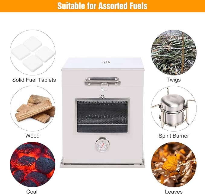 - Multiple Uses: The portable camping oven fits assorted fuels, such as wood, leaves, coal and so on. You can use it to bake bread, cookies, chicken, beef and so on. It is suitable for mountain climbing, camping, hiking and picnicking. It is your good outdoor helper.