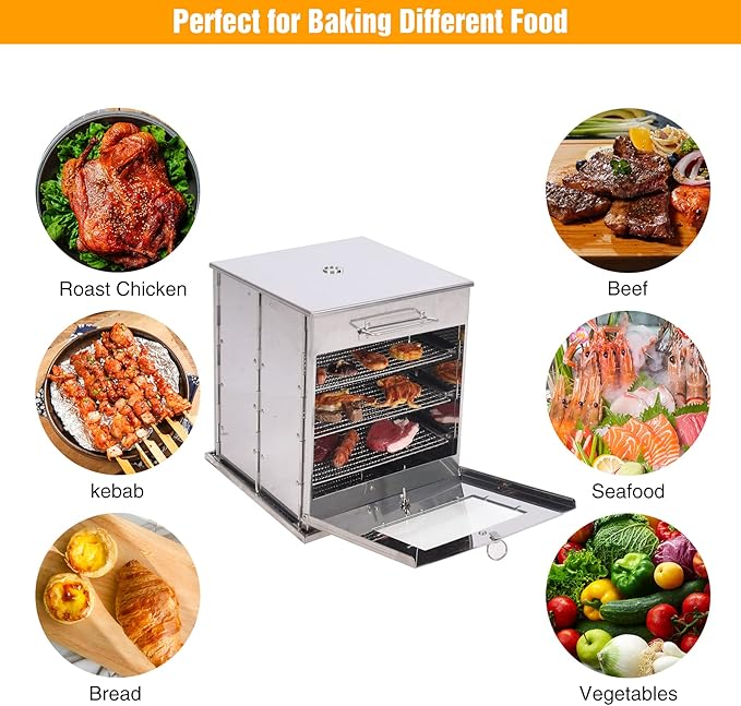 - Easy Assembly: The camping oven is simple in structure and easy to install. It mainly includes the main body of the oven, a cover plate and a bottom plate, and 3 pieces of baking net. You can complete the installation in a short time.
