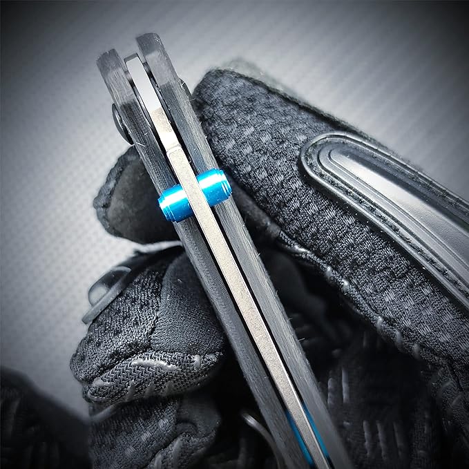 - The knife has a black carbon fiber handle with a generous angled lanyard hole at the top of the handle butt that can easily handle the paracord lanyard. It is fitted with blue anodized aluminum spacers that match the blue thumb lugs. The gorgeous weave carbon fiber handle is a major upgrade on this knife. It looks great and is extremely strong.