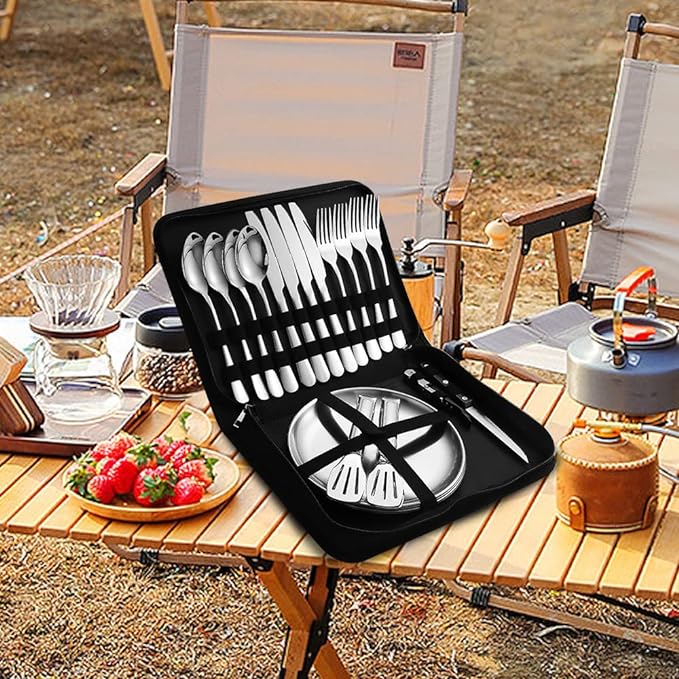 - SILVER CMAPING DINNERWARE SET FOR 4: This portable flatware set is designed specifically for all your outdoor dining needs. The compact foldable design makes it easy to store and transport,Includes camping plates and utensils and camping fork spoon knife set food tongs bottler opener.invest in a durable and reusable set that will elevate your dining experience wherever you go.
