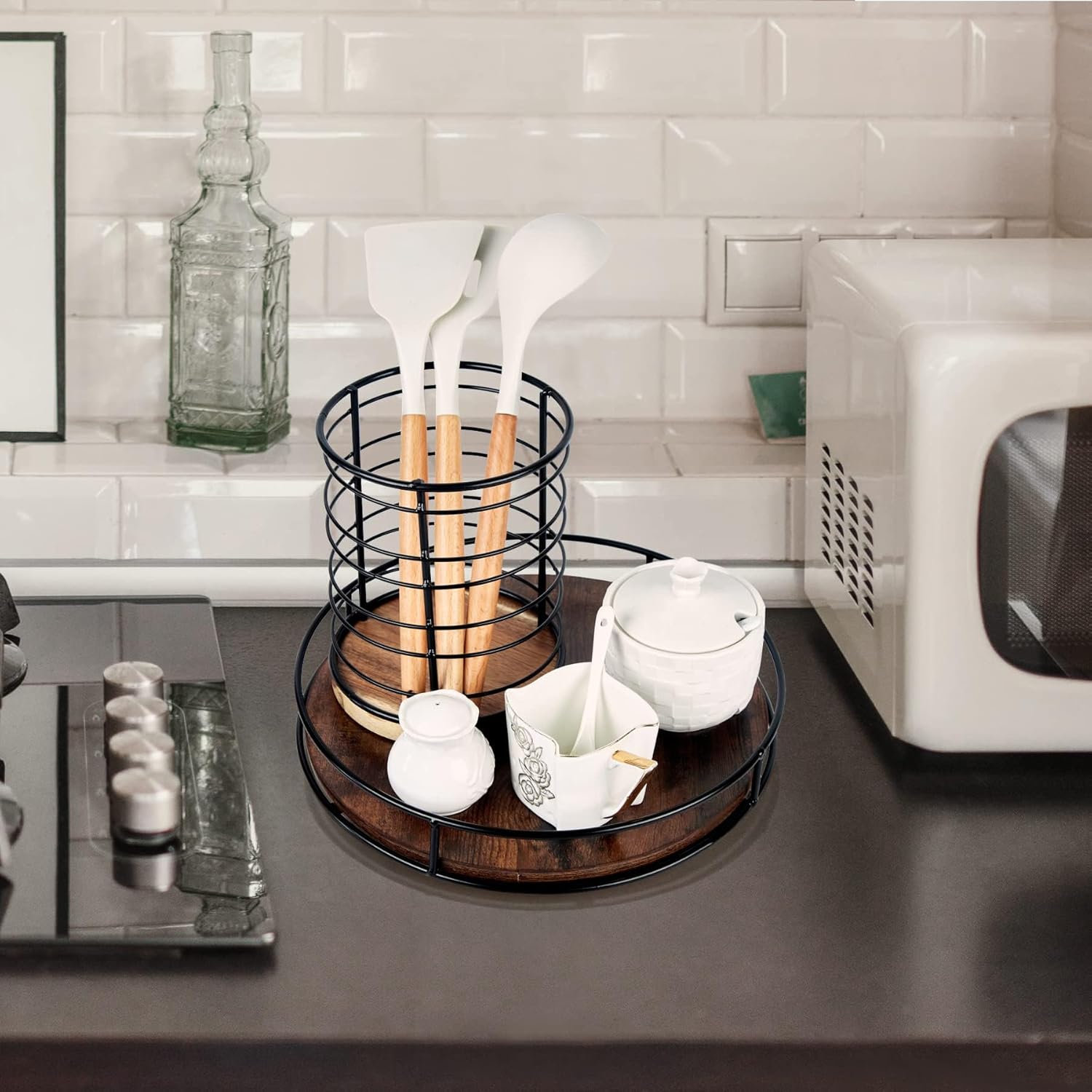 10 Inch Wood Lazy Susan, Rustic Brown Turntable Organizer with Steel Frame, 360 Degree Decorative Turntable for Countertop or Centerpieces
