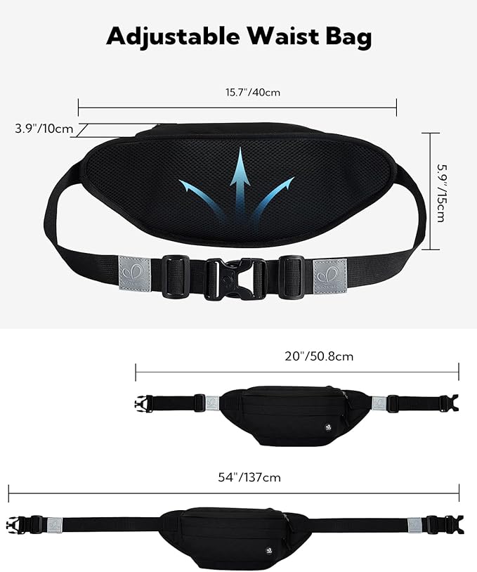 - AROUND MY WAIST: Waist belt adjustable length 4"~38"(Fit Waist Circumference: 20"~54"), so you can customize the waist pack to fit your body, ergonomic belt design, so you will not feel bulky or cumbersome