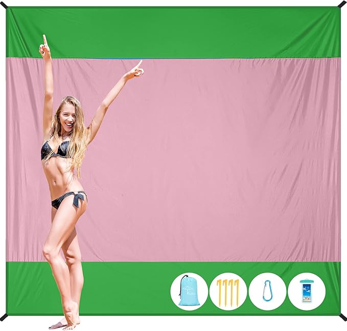 - Oversized Beach Picnic Mat:Package includes 4 ground stakes,1 carabiner,Keep out the wind because fixed With 4 fixed anchors,For vacation, hiking, or family garden parties.