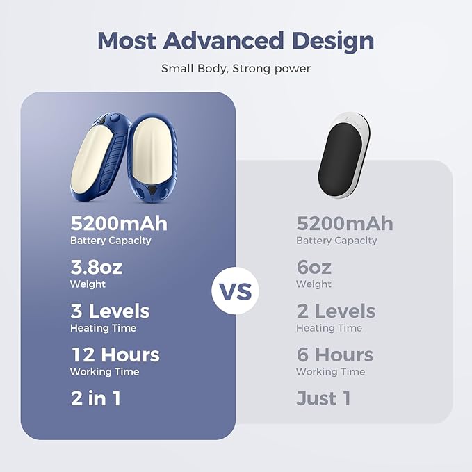 - Long-lasting Heating Than Ever - This electric hand warmer adopt a new heating scheme and battery, minimal weight and maximum lasting Heating, provide up to 12 hours of heat.