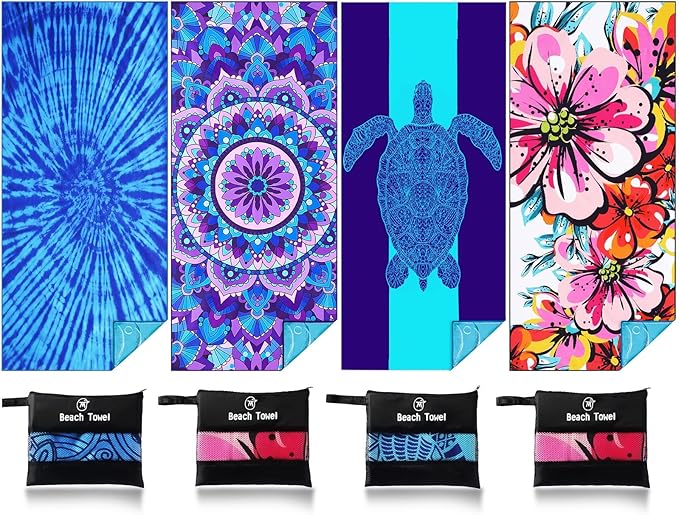 4 Pack Lightweight Thin Beach Towel Oversized 71"x32" Big Extra Large Microfiber Sand Free Towels for Adult Quick Dry Travel Camping Beach Accessories Vacation Gift Turtle Tie Dye Mandala Flower