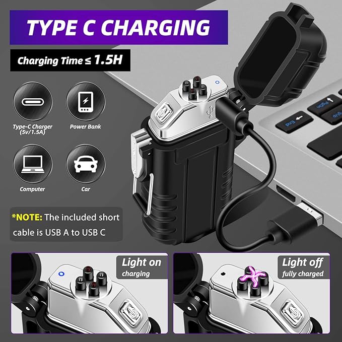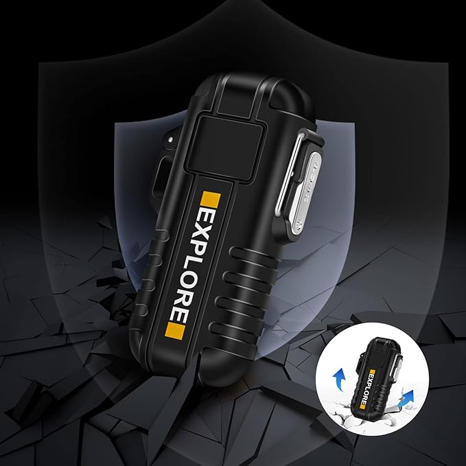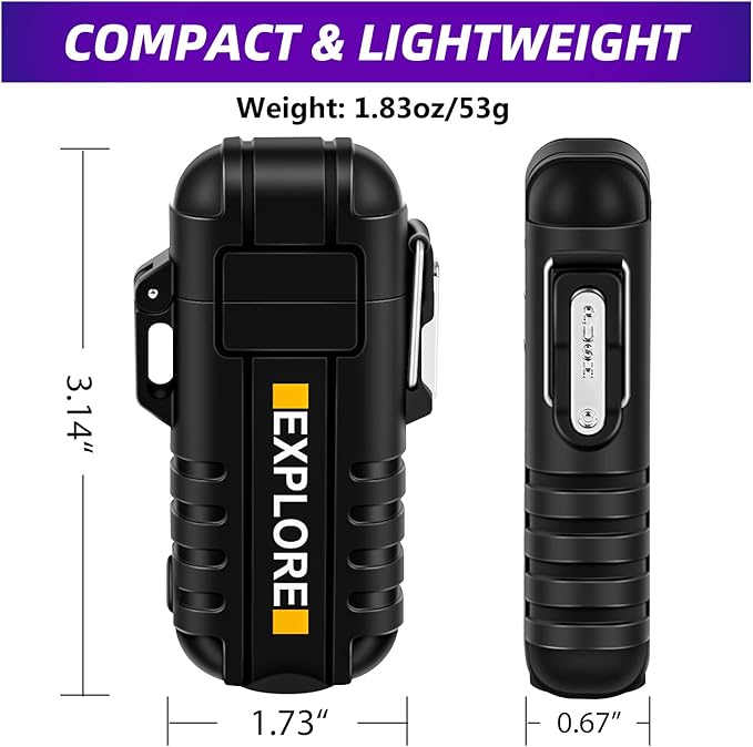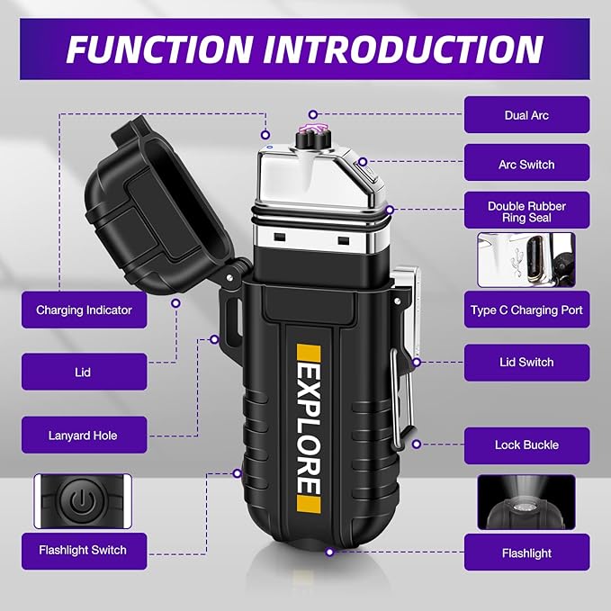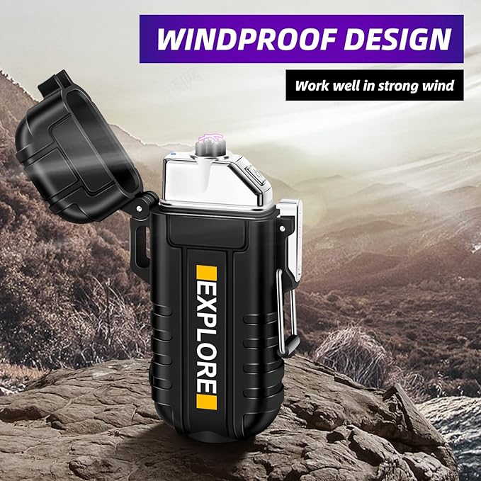 - Main Features: IP56 dustproof and waterproof lighter, dual arc windproof lighter, USB-C Electric Lighter, 3 modes flashlight camping lighter, survival lanyard with whistle. Can be used as a fire starter, camping gear, tactical gear, survival tool, etc