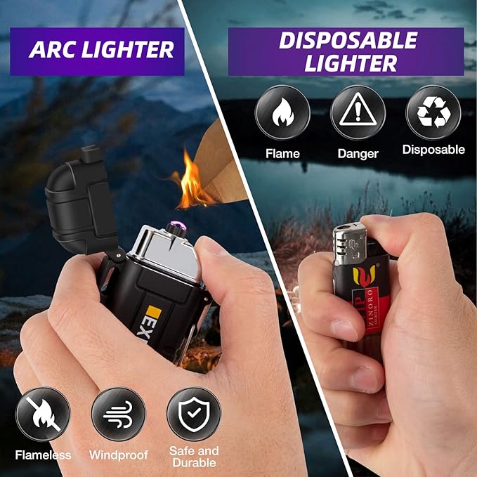 - Flameless Arc Lighter: No open flame, start fire is less restricted by weather conditions. X dual arc design, with strong wind resistance, working efficiently in outdoor environments, like camping, adventure, survival, beach, hiking, etc