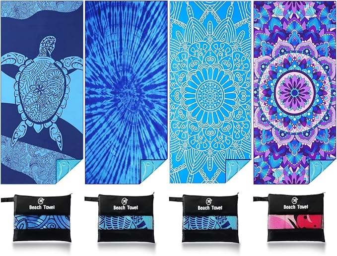 4 Pack Lightweight Thin Beach Towel Oversized 71"x32" Big Extra Large Microfiber Sand Free Towels for Adult Quick Dry Travel Camping Beach Accessories Vacation Gift Blue Turtles Tie Dye Mandala