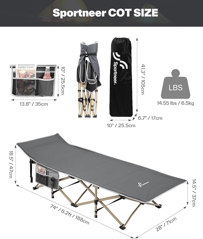 - Comfortable Mattress: Sportneer Camping Cot with mattress, soft pad add extra comfort, you can sleep more comfortably in this portable foldable bed for camping. In summer, the camping cot for adults can also be take away to increase the breathability.