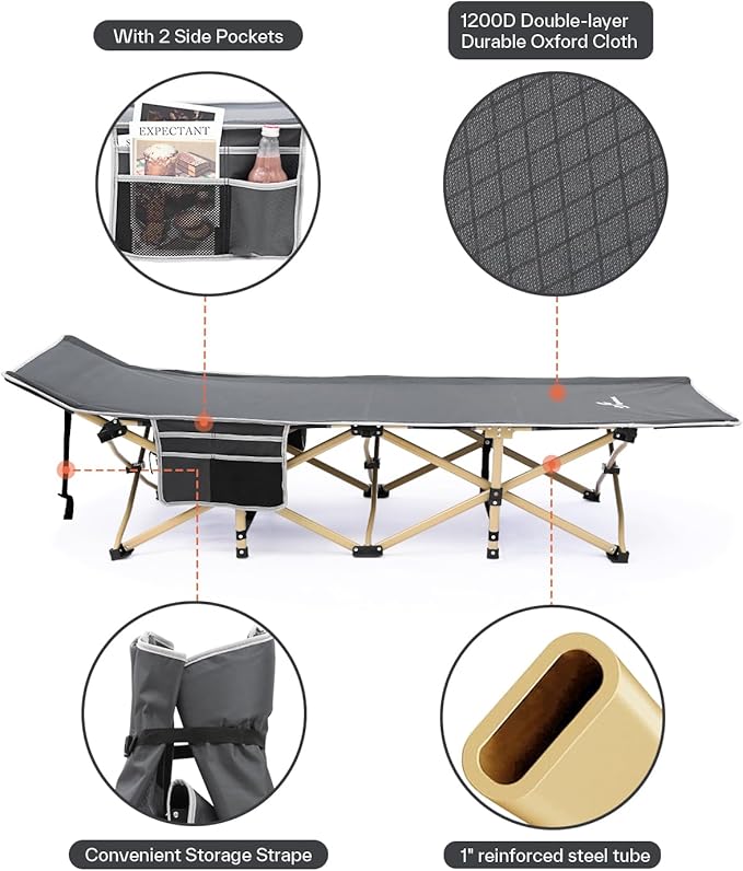 - Double sided Pocket Design: The two lagre pockets of sleeping cots for adults keep all your things handy right next to you! The ultra convenient side pockets store sunglasses, books, phones, headphones, water bottles and so much more!